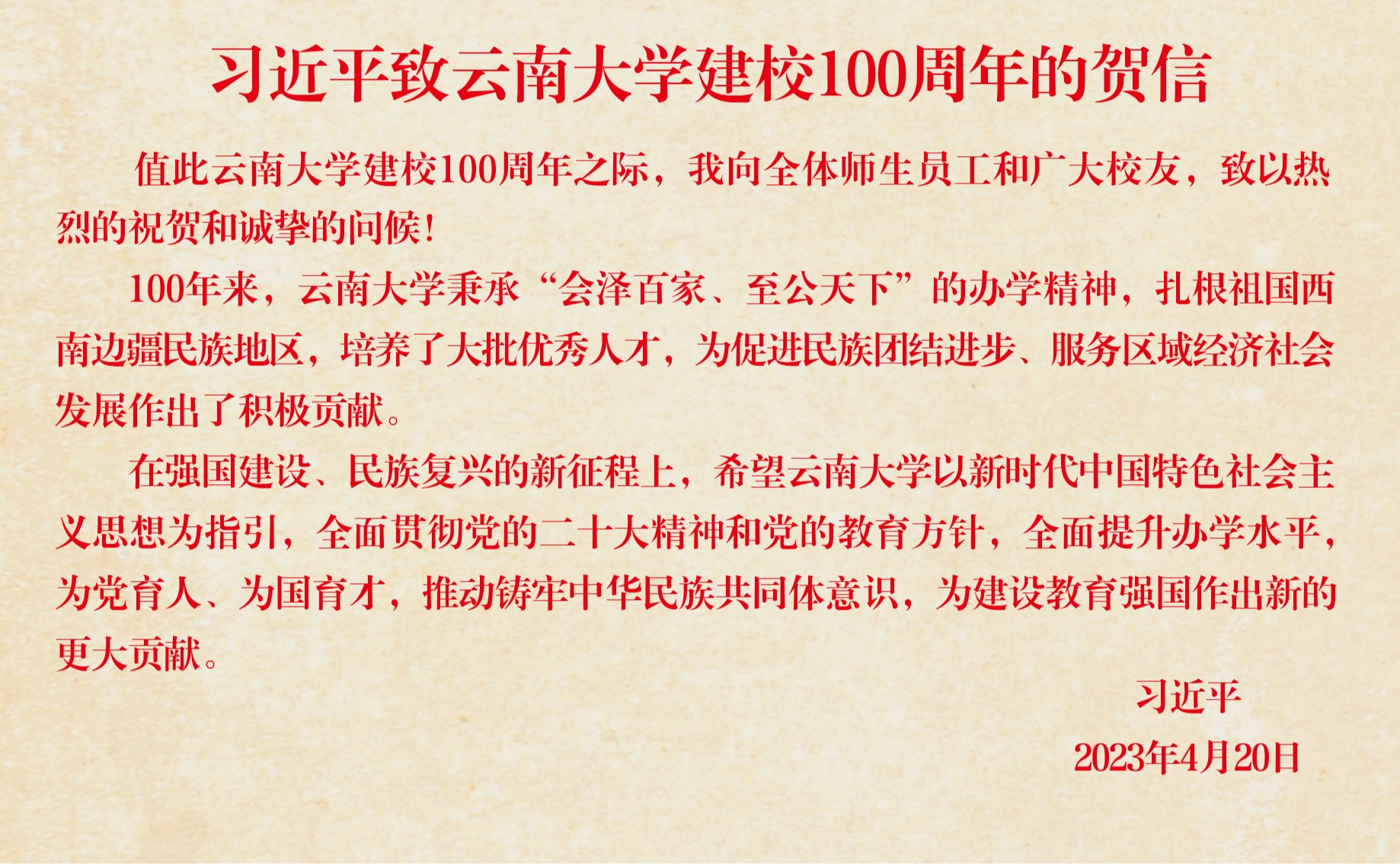 习近平致信祝贺云南大学建校100周年