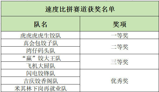 在速度赛道中,每组4名选手需在3分钟内比拼包饺子数量。选手们手法娴熟,指尖翻飞间,一个个饱满的饺子迅速成型。最终,“虎虎虎虎生饺”队以3分钟包64个合格饺子的成绩斩获一等奖,“真会包饺子”队和“湾仔码头”队也紧追其后,获得“速度比拼”二等奖。