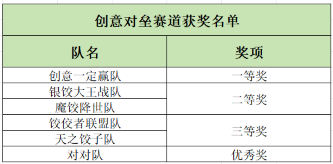创意赛道则更具趣味性与挑战性,各小组需在5分钟内完成兼具美观与创意的饺子作品。在5分钟之内,各组同学完成了样式新奇的创意饺子,其中“创意一定赢”队以创意新奇的造型饺子惊艳全场,其创新想法获得评委一致认可,摘得该赛道桂冠。“银饺大王”和“魔饺降世”队也凭借优秀的饺子造型创意获得第二名。现场评委由学生会、研究生会工作人员及到场老师组成,从作品完成度与创意理念两方面