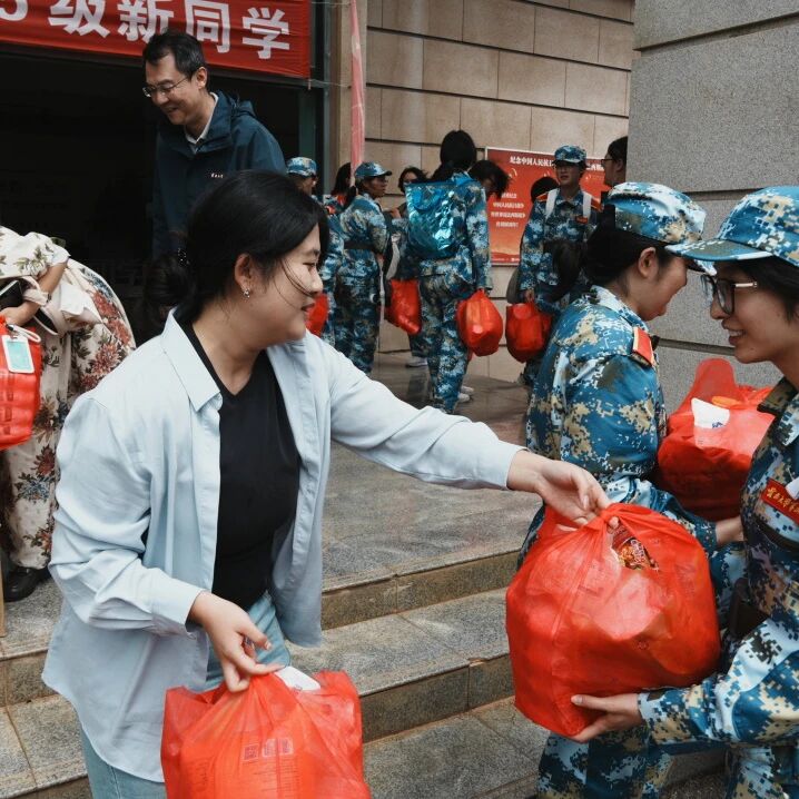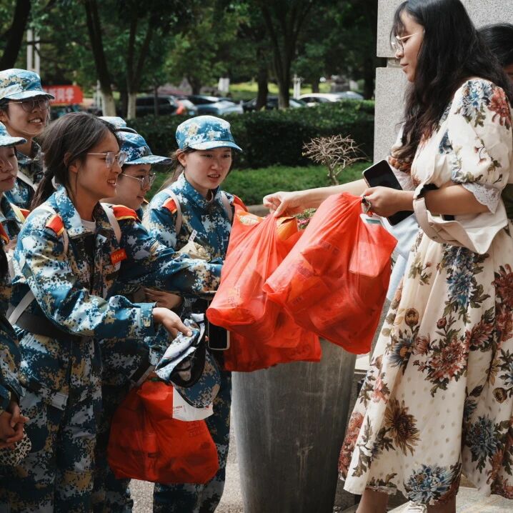 学院为同学们准备了面包、纸巾等慰问物资,同学们依次领取了慰问物品。愿新同学们带着学院的殷切希望,在军训场上、在大学校园里不负青春、超越自我。