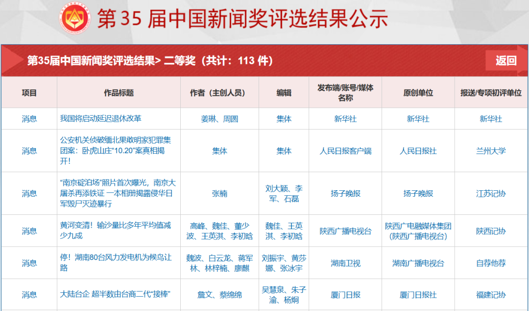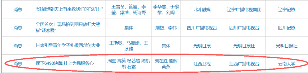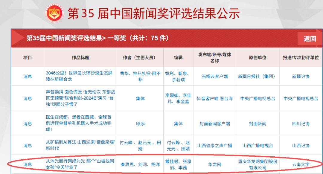 近日,中华全国新闻工作者协会(简称“中国记协”)在中国记协微信公众号、中国记协网公示了拟获第35届中国新闻奖的378件作品,其中特别奖4件、一等奖75件、二等奖113件、三等奖187件。云南大学新闻学院组织初评并报送的重庆华龙网《从沐光而行到成为光 那个“山坡找网女孩”今天毕业了》和江西广播电视台《摘下6490块牌 挂上为民服务心》两件作品分别拟获消息类一等奖和二等奖,在全国具有推荐资格的43家教研机构中取得了突出的成绩。